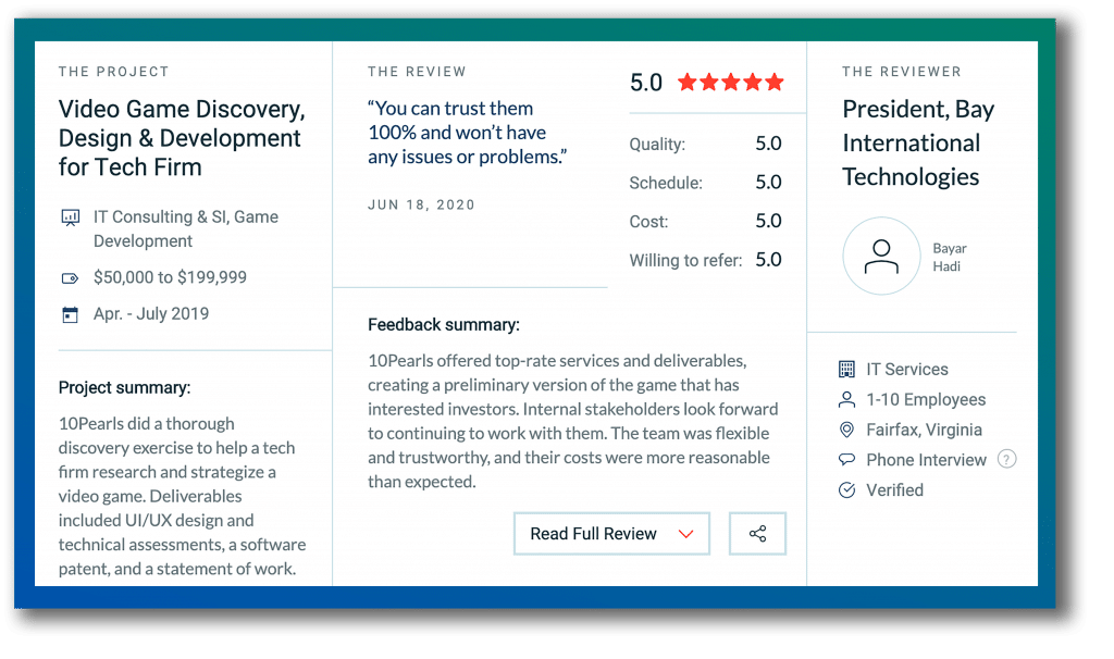 We especially want to thank our clients and partners for their honest reviews and for making this recognition possible. Below is one of the dozens of glowing reviews provided by happy 10Pearls clients, providing a snapshot of our work.